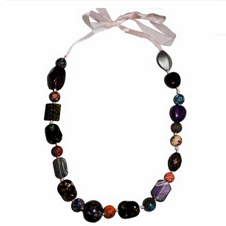 Оригинальные бусы на ленте. В ассортименте ленты разного цвета и разная комбинация камней. Общая длина – 115 см. Длина бус с камнями – 49 см. Диаметр камней – от 1 до 3 см.