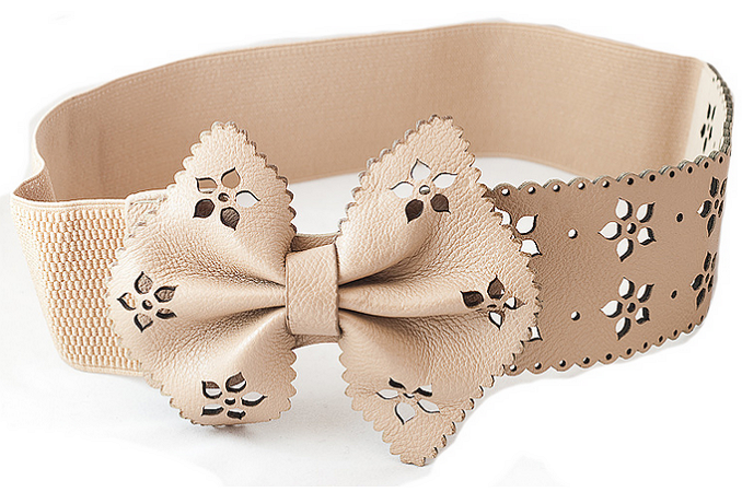 Нарядный пояс резинка бежевого цвета с отделкой из ажурного кожзаменителя. Пояс украшен крупным бантом. Ширина резинки 6 см, ширина декоративной части 6 см, длина банта 13 см. Длина пояса в нерастянутом состоянии 68 см. Застегивается на кнопки.